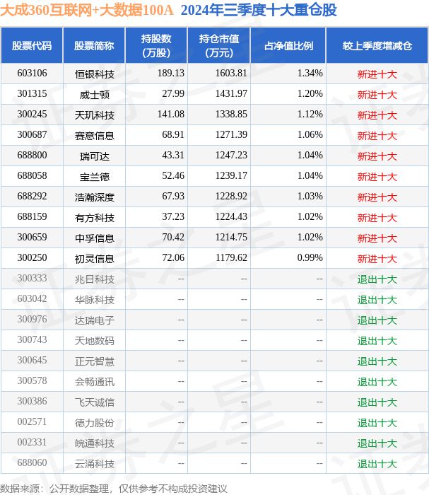 根据2024基金Q3季报公募基金重仓股数据,重仓该股的公募基金共7家,其中持有数量最多的公募基金为大成360互联网+大数据100A。大成360互联网+大数据100A目前规模为5.44亿元,最新净值2.2209(1月10日),较上一交易日下跌3.35%,近一年上涨4.71%。该公募基金现任基金经理为夏高。夏高在任的基金产品包括:大成沪深300增强发起式A,管理时间为2021年2月23日至今,期间收益率为-20.55%;大成动态量化配置策略混合A,管理时间为2023年4月14日至今,期间收益率为-27.5%;大成中证500指数增强A,管理时间为2024年7月19日至今,期间收益率为8.3%。